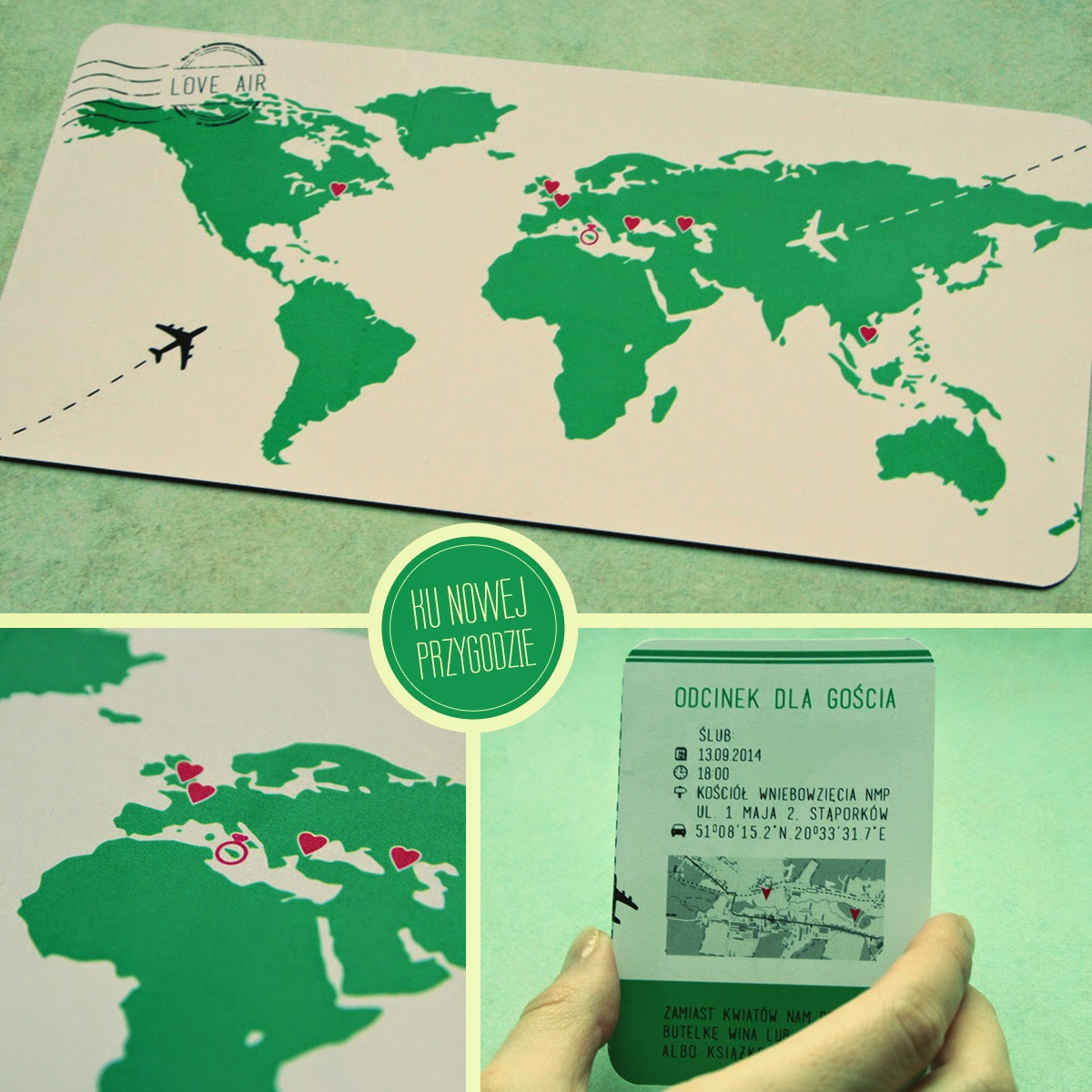 Kolejna podróżnicza propozycja dla par, które kochają wspólne wyjazdy i kolekcjonują wspomnienia z dalekich wypraw. Zieleń i biel to kolory przewodnie, ale udało się przemycić też odrobinę amarantowego akcentu. Zaproszenia w formacie biletu lotniczego.